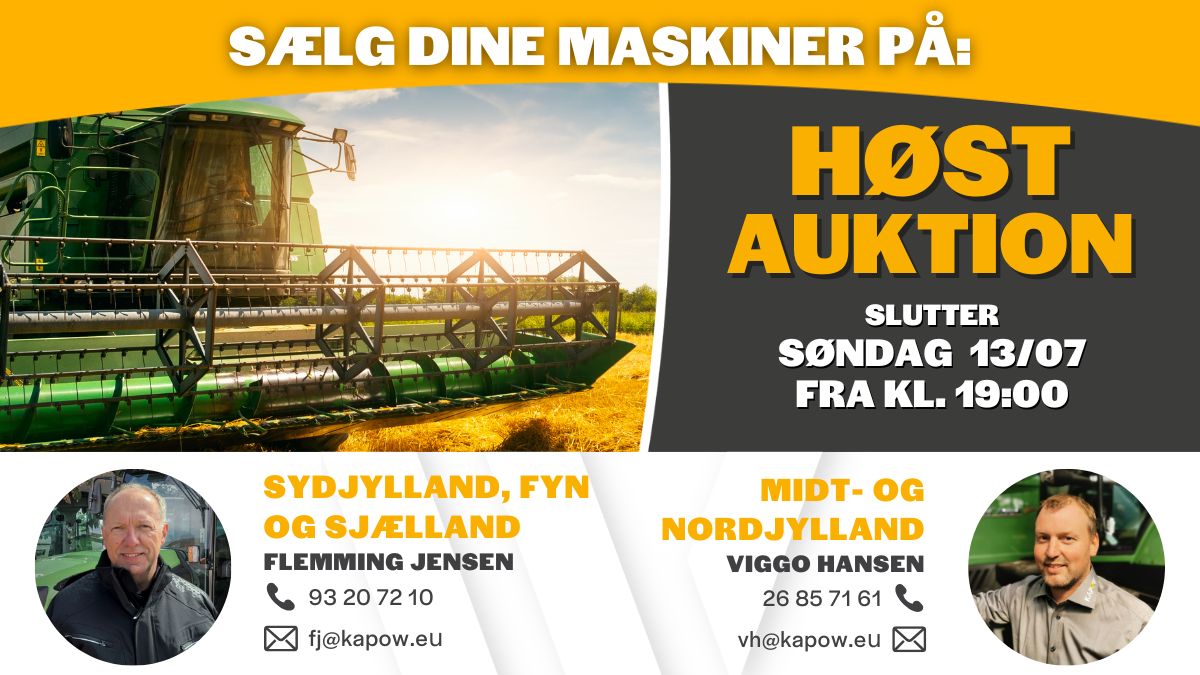 Går du med planer om at udskifte traktorer, varevogne eller andet materiel til dit landbrug eller din virksomhed? Så kan der være mange penge at spare, hvis du vælger at deltage i ophørsauktioner på maskiner og udstyr her hos Kapow. Vi afholder altid en gennemsynsdag, inden auktionen slutter, så du har mulighed for at besigtige det materiel, du har i kikkerten, inden du placerer dit bud. Er du forhindret i at deltage, eller er den geografiske distance for stor, finder du her på siden en lang række billeder og udførlig information om de enkelte produkter. Du har naturligvis også mulighed for at kontakte vores personale for specifik information om de enkelte auktioner, hvis du sidder inde med spørgsmål.